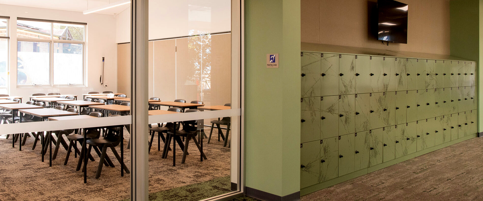 In this stage of the project, lockers are located within circulation corridors and finished in a Pale Eucalypt powder coat, allowing them to integrate seamlessly with the architectural palette of the learning spaces. The colour references the surrounding landscape and the sandstone tones of Eringa House, while the inclusion of First Nations Buunhu perforation adds cultural significance and visual texture to the joinery elements.